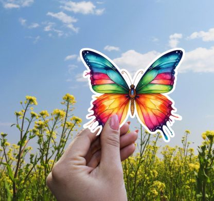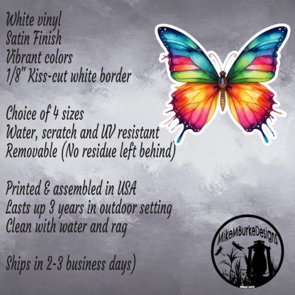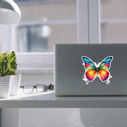 This butterfly sticker laptop decal features vibrant colors, a satin finish, and kiss-cut edges with white borders. Made from waterproof vinyl, it’s a nature-inspired accent ideal for laptops, journals, and water bottles.