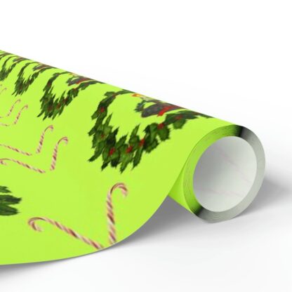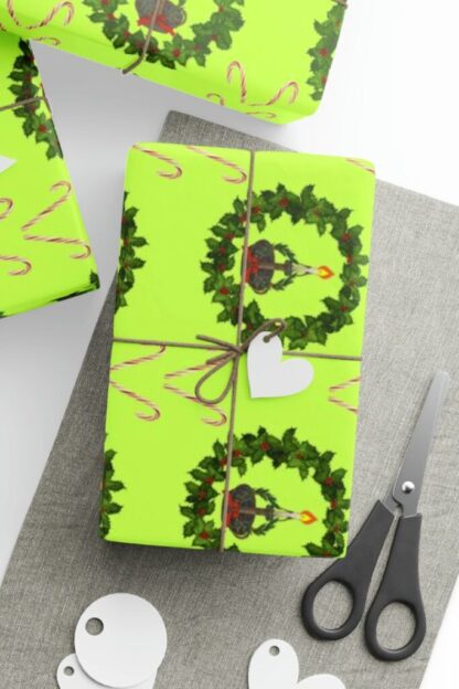 Make your gifts stand out with this bright green Christmas wrapping paper roll! Gift paper roll features a wreath design with an old fashioned candle inside. Then each corner of this green Christmas wrapping paper contains a candy cane. This green Christmas wrapping paper is perfectly festive! You will also find this design in my shop available on white gift paper. Green Christmas wrapping paper comes in three sizes and lengths at 30″ x 36″, 30″ x 72″ and 30″ x 180″. Christmas wrapping paper arrives in a roll. Green Gift paper is printed on 90 gsm fine art paper with your choice of a glossy or matte finish and in vibrant colors. Discover a treasure trove of Christmas wrapping paper rolls in my shop, each with its own distinctive charm. Start creating cherished memories, one beautifully wrapped gift at a time. Don’t wait – order now and experience the joy of giving like never before!
