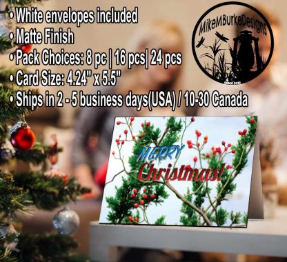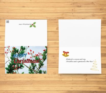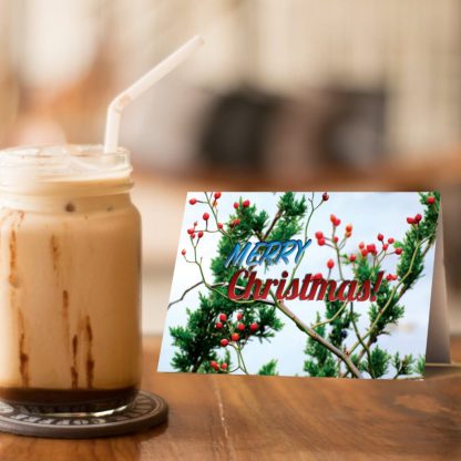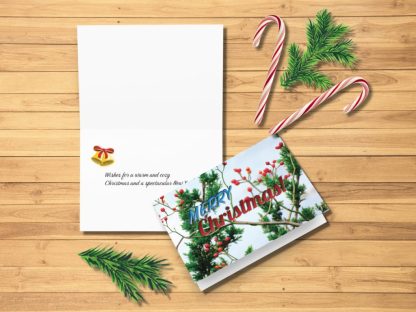 A stunning glossy Christmas card captures the magic of a serene winter wonderland. This elegant holiday card features a charming winter scene of vibrant red berries on tree branches, set against a backdrop of lush green pine trees. Perfect for sending warm Merry Christmas wishes to loved ones, this greeting card is a timeless way to share the joy of the season. This greeting card is sold individually, making it easy to order the exact quantity you need. Whether it’s used to send a heartfelt Merry Christmas or given as a Christmas gift, this card is sure to spread joy. Bring the beauty of the season into your holiday traditions with this exquisite Christmas card.