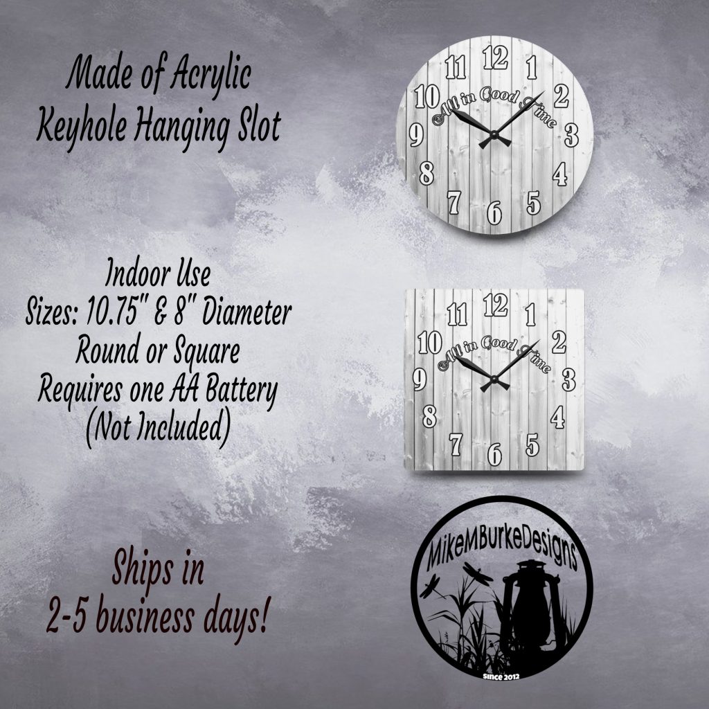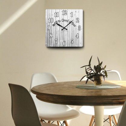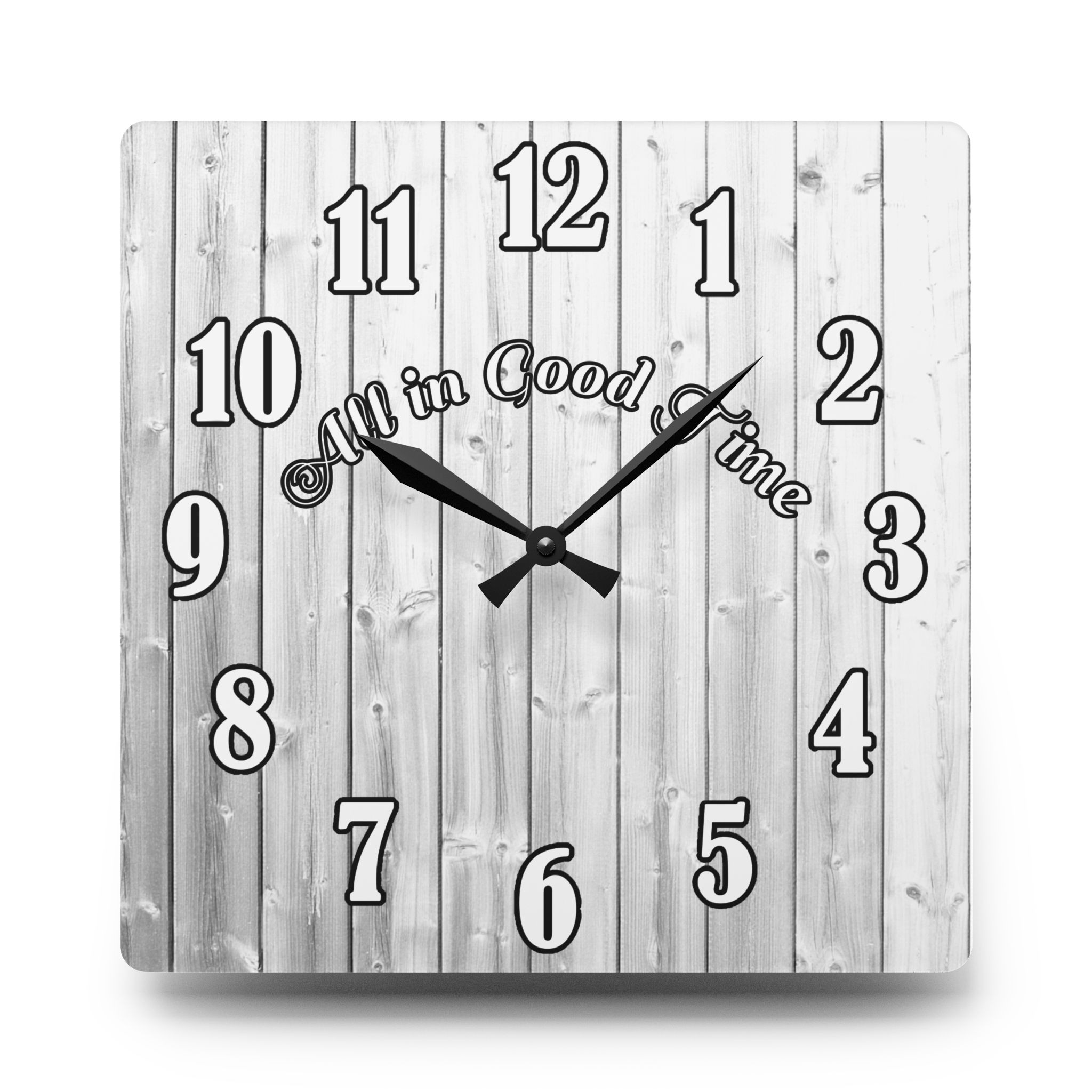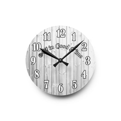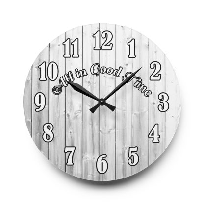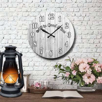 Add a witty touch to your space with this wall-mounted clock with quote “All In Good Time.” Battery operated and ideal as a home or funny gift.