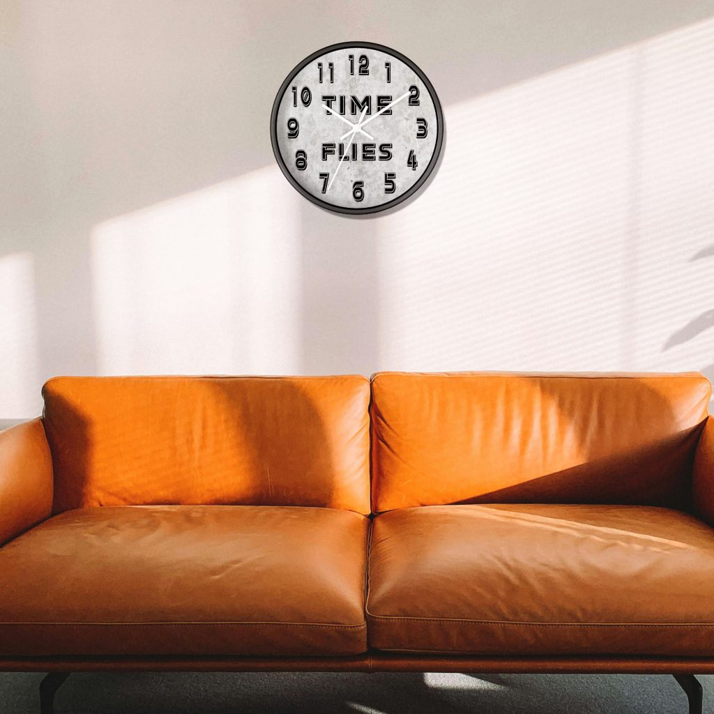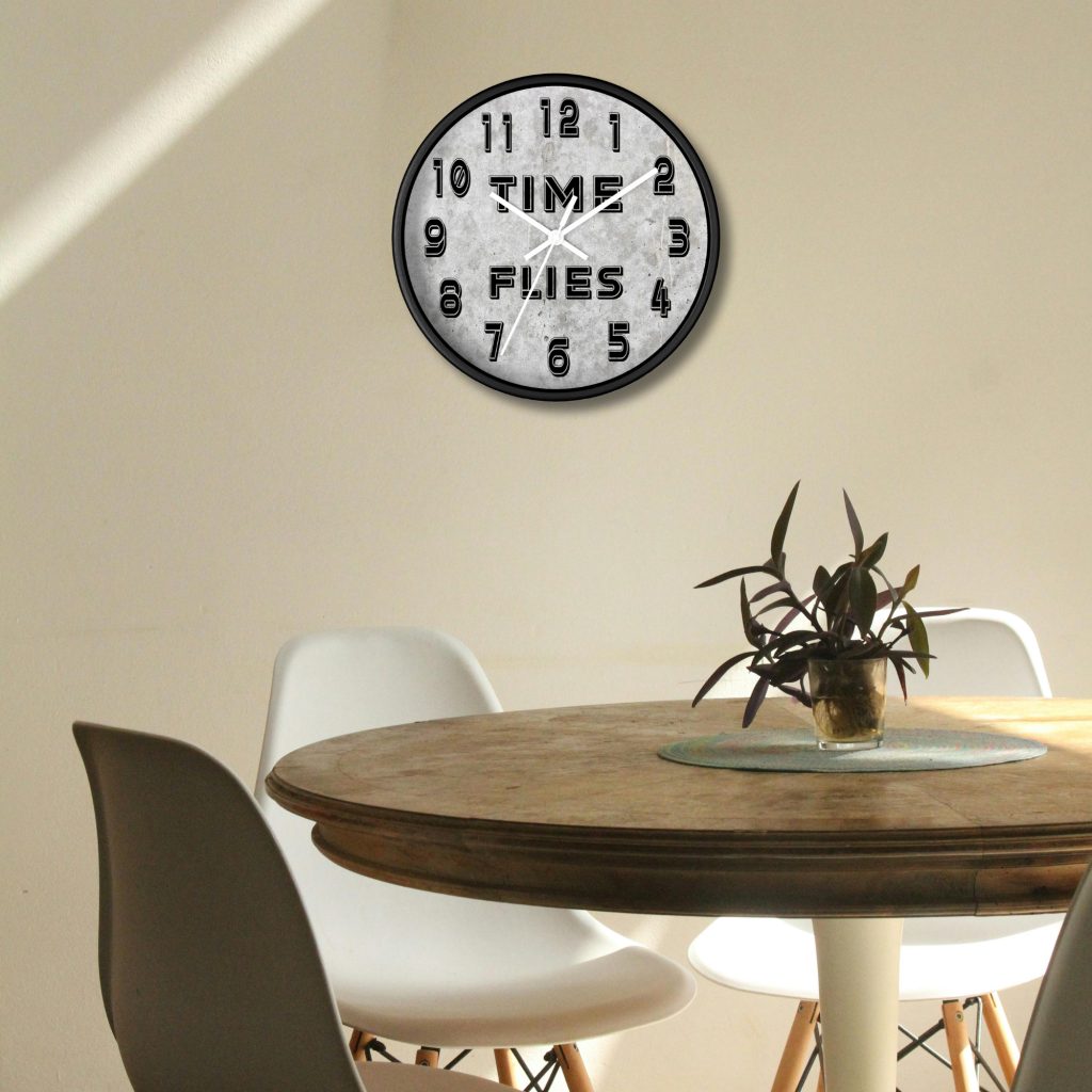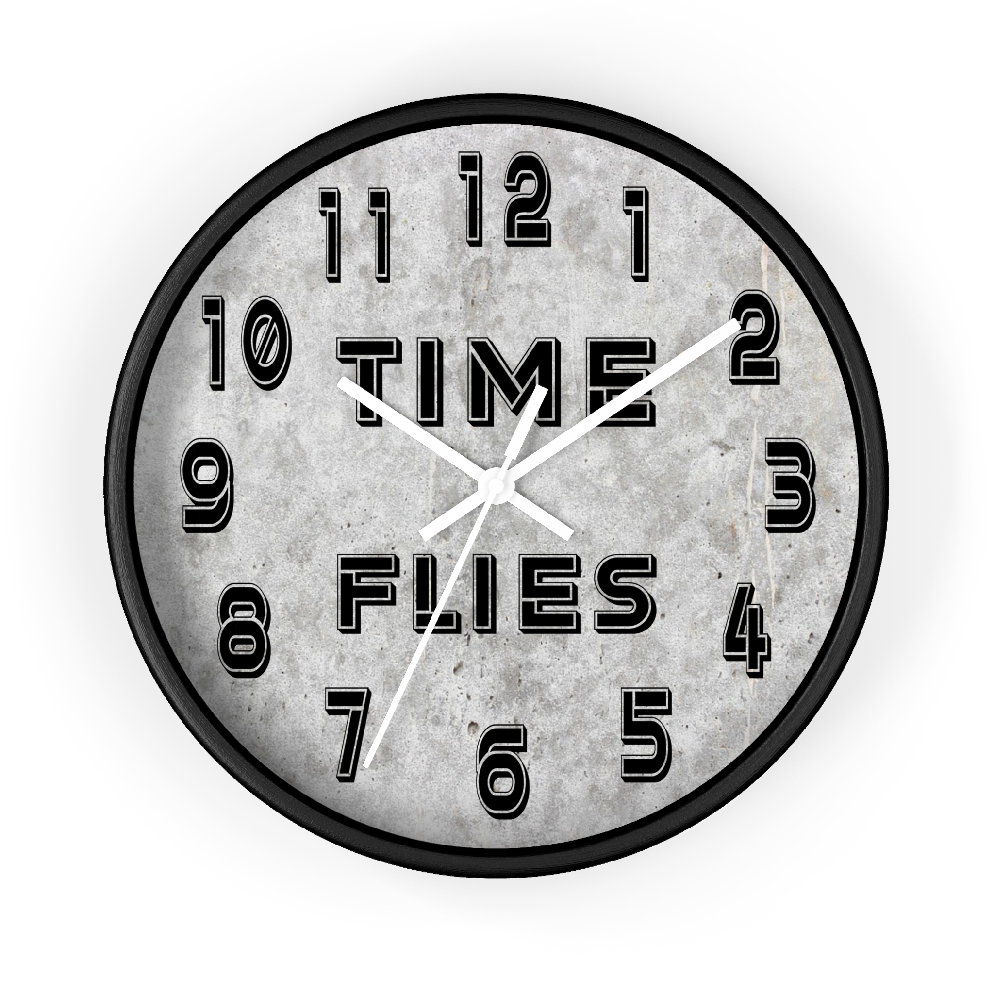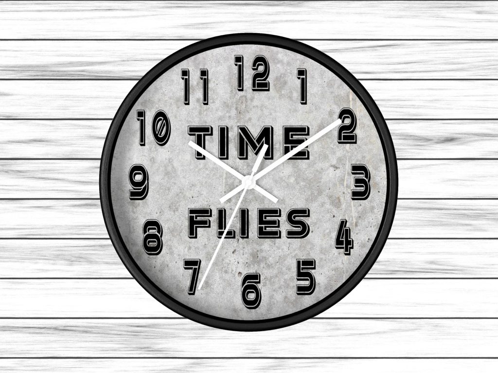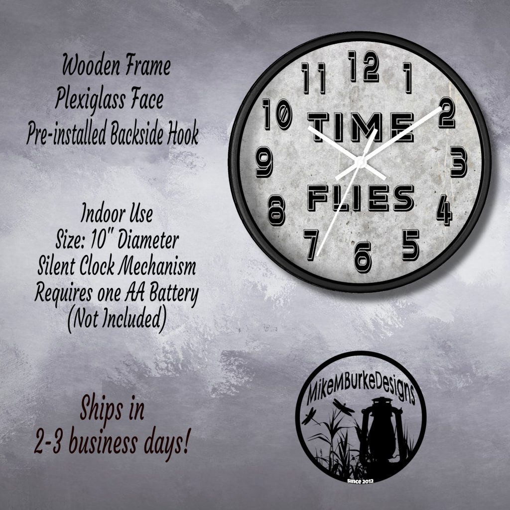 Celebrate the speed of life with this wall-mounted clock with quote “Time Flies.” Battery operated and ideal as a funny or thoughtful gift for home decor lovers.
