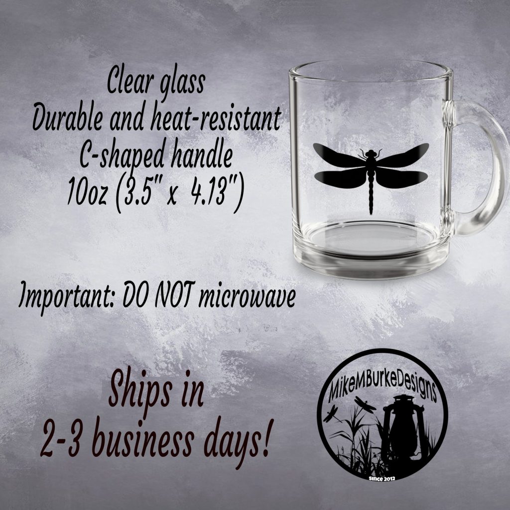 This 10 oz dragonfly glass mug features a clear, heat-resistant body and a c-shaped handle—ideal for nature lovers who enjoy tea, coffee, or botanical kitchen decor.