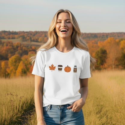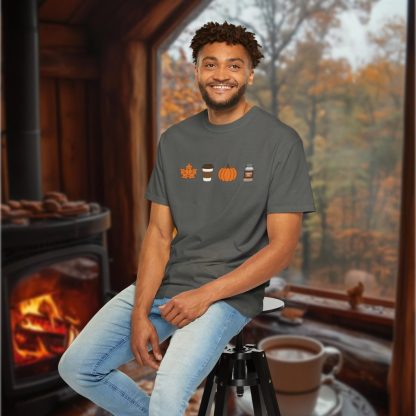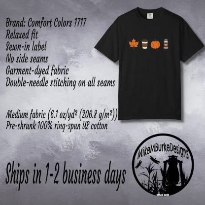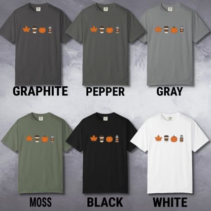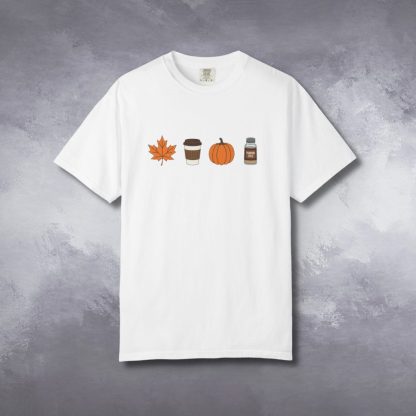 Celebrate the season with this fall themed t-shirt, featuring a fall leaf, coffee cup, a pumpkin and pumpkin spice. Crafted from pre-shrunk 100% ring-spun cotton. A relaxed fit comfort colors tee ideal for nature lovers and fall gifting.