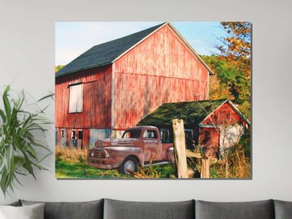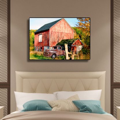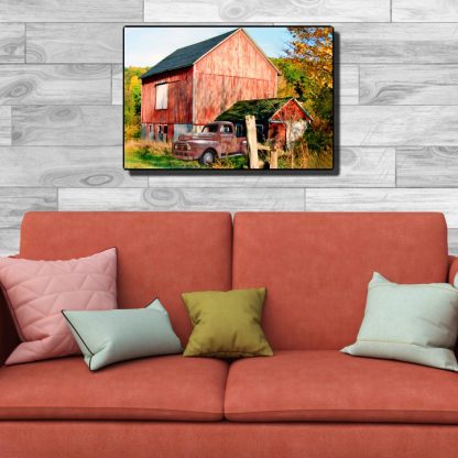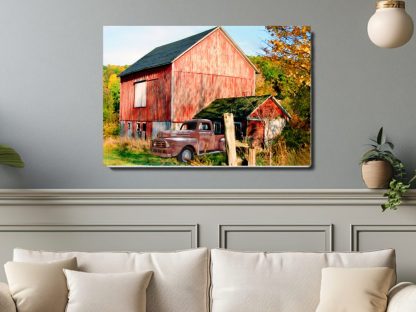 This canvas wall art features a red antique truck parked next to a decaying New England rustic red barn, set against the backdrop of a vibrant fall landscape on a bright, sunny day.