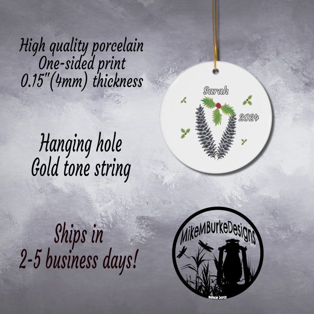 Elevate your holiday decor with the exquisite beauty of our Beautiful personalized Christmas ornament. This captivating ornament features a hand-painted print of pine cones, exuding a natural charm that evokes the essence of winter forests. Topped off with vibrant holly and red berries, it adds a festive touch to any Christmas tree or decoration. Personalized Christmas Ornament is the ultimate and memorable gift. You can add any name and the year making this the perfect addition to your yearly traditions and memories. Crafted with attention to detail, this custom ornament seamlessly blends rustic decor with a touch of elegance, making it perfect for log cabin decor or any holiday setting. It serves as an ideal Christmas gift, stocking stuffer, or a thoughtful gift for dad or husband. Embrace the serenity of nature with this enchanting ornament, capturing the magic of the season. Let this rustic personalized Christmas ornament be a cherished addition to your Christmas collection, symbolizing the beauty and wonder of the winter landscape.