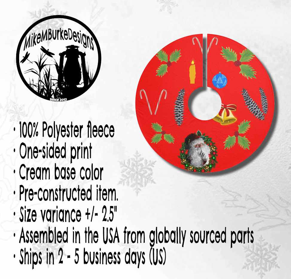 This Christmas give your tree a makeover with this lovely red Christmas tree skirt featured festive designs. This 100% polyester fleece red Christmas tree skirt features images of holly and berries, candy canes and Santa Claus in a wreath. Red Christmas tree skirt features hemmed edges, one-sided print and is assembled in the USA. Makes for the perfect first home housewarming gift or as a wedding gift. Add this beautiful red Christmas tree skirt to your home today!