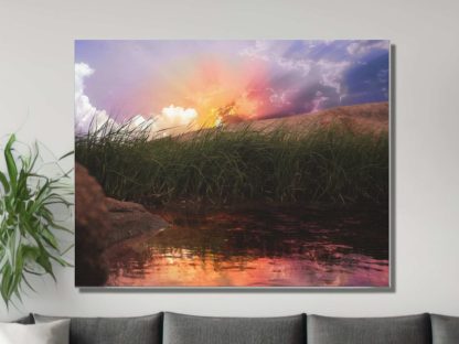 Enhance your rustic lake house decor with this exquisite Canvas Wall Art landscape print featuring a waterscape scene, a must-have for farmhouse enthusiasts. This beautiful canvas print captures the serene charm of nature, making it an ideal gift for him or any cabin-loving individual. Immerse yourself in the idyllic countryside setting as the rising sun casts its soft colors over a small whimsical pond adds a touch of authenticity, evoking a sense of tranquility and nostalgia. Designed to complement country or farmhouse decor, this stunning sunset art brings a breath of fresh air to any space, whether it’s a living room, bedroom, office or perfect gift for men. Crafted with a discerning eye for quality, this high-resolution print ensures vibrant colors and sharp details. Transform your surroundings and treat yourself or your loved ones to this captivating canvas wall art, a timeless addition to any rustic-inspired interior.