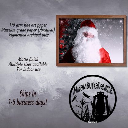 Capture the true essence of Christmas with this captivating Santa Claus Print Christmas Wall Art Print. Featuring a wonderful portrait of the real Santa himself, this Christmas poster brings the magic of the season to life. Set against a festive background adorned with a beautifully decorated Christmas tree and whimsical snowflakes falling gently, this artwork adds a touch of enchantment to any space. Perfect as a Christmas decoration or Christmas wall art, this print embodies the joy and spirit of the holiday season. Whether you’re searching for a unique kid’s gift, or a cherished Christmas decoration for the home, this Santa Claus print is sure to delight. Embrace the magic of Christmas and elevate your decor with this stunning Santa Claus Christmas Wall Art Print that captures the essence of the season in a truly enchanting way.