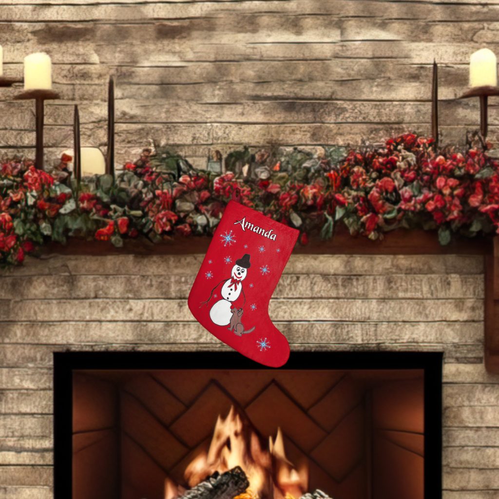 Make your Christmas decor truly heartwarming with this charming personalized Christmas stocking. The print showcases a hand-painted scene of a smiling snowman affectionately petting a little puppy. The adorable puppy sports a big Rudolph red nose and playful antlers, adding a touch of whimsy to the design. This cute stocking is not only a delightful addition to your custom family stockings collection but also makes a thoughtful gift for her or a cherished mom gift. It’s also a perfect choice for a gift for him, including a beloved dad gift. The versatile design makes it an ideal kid’s gift, sparking their imagination and excitement. Hang this cherished personalized Christmas stocking with care and let the heartwarming scene of the snowman and puppy bring love and warmth to your holiday celebrations.