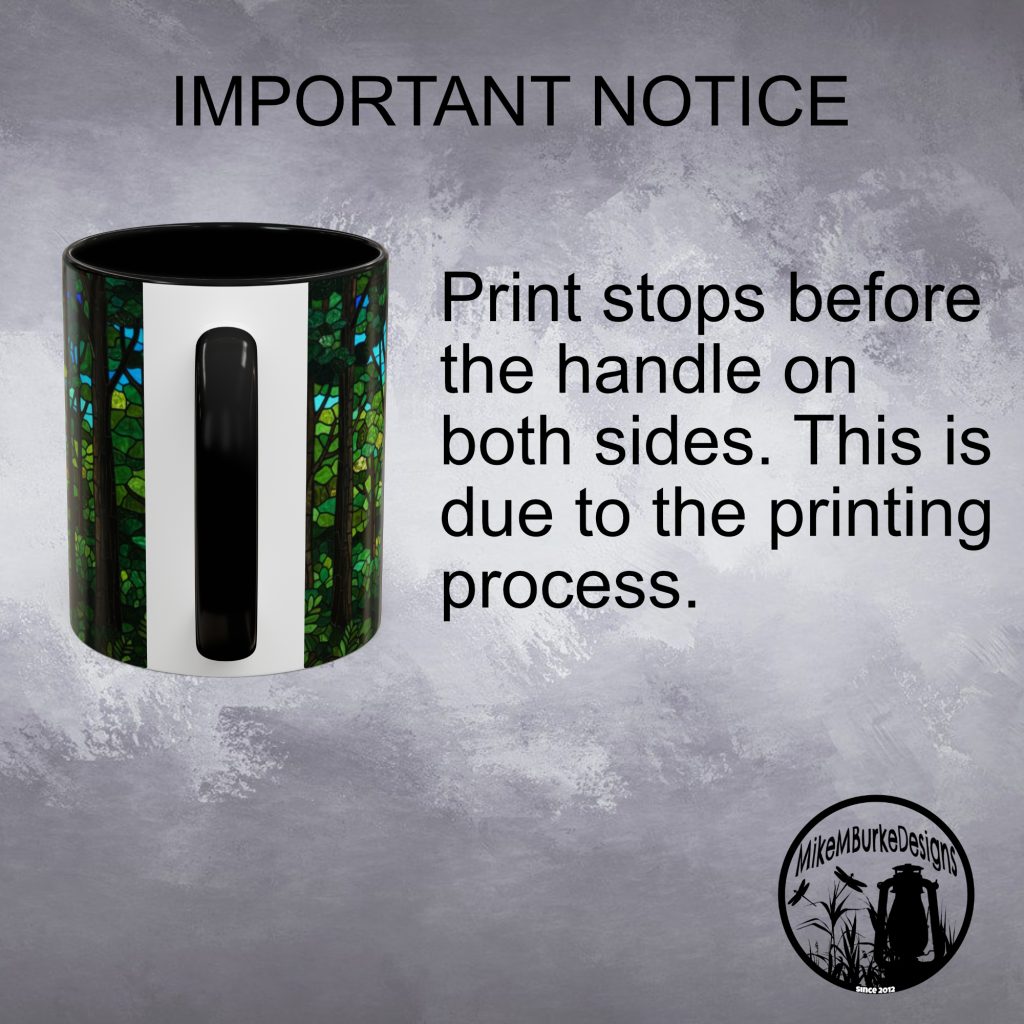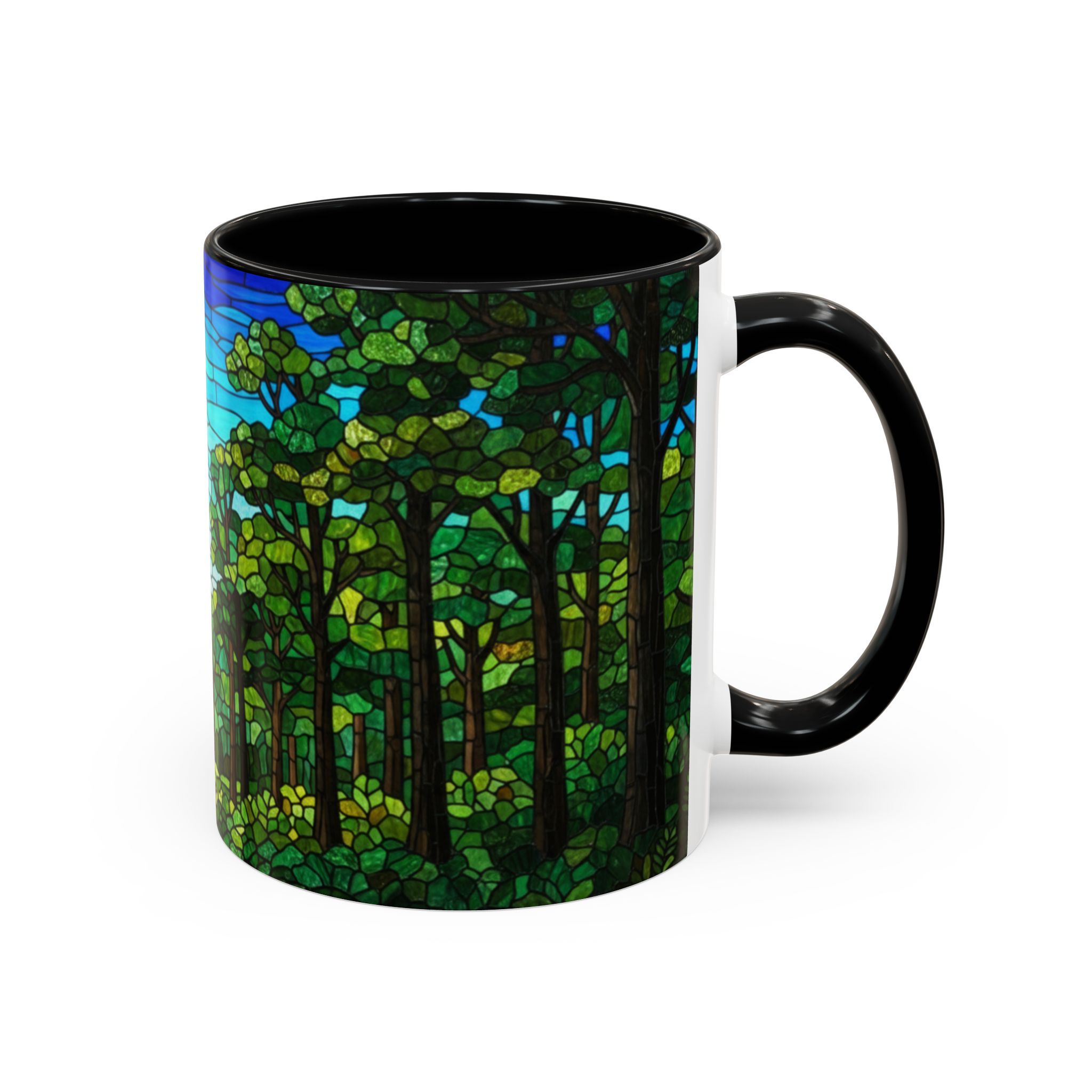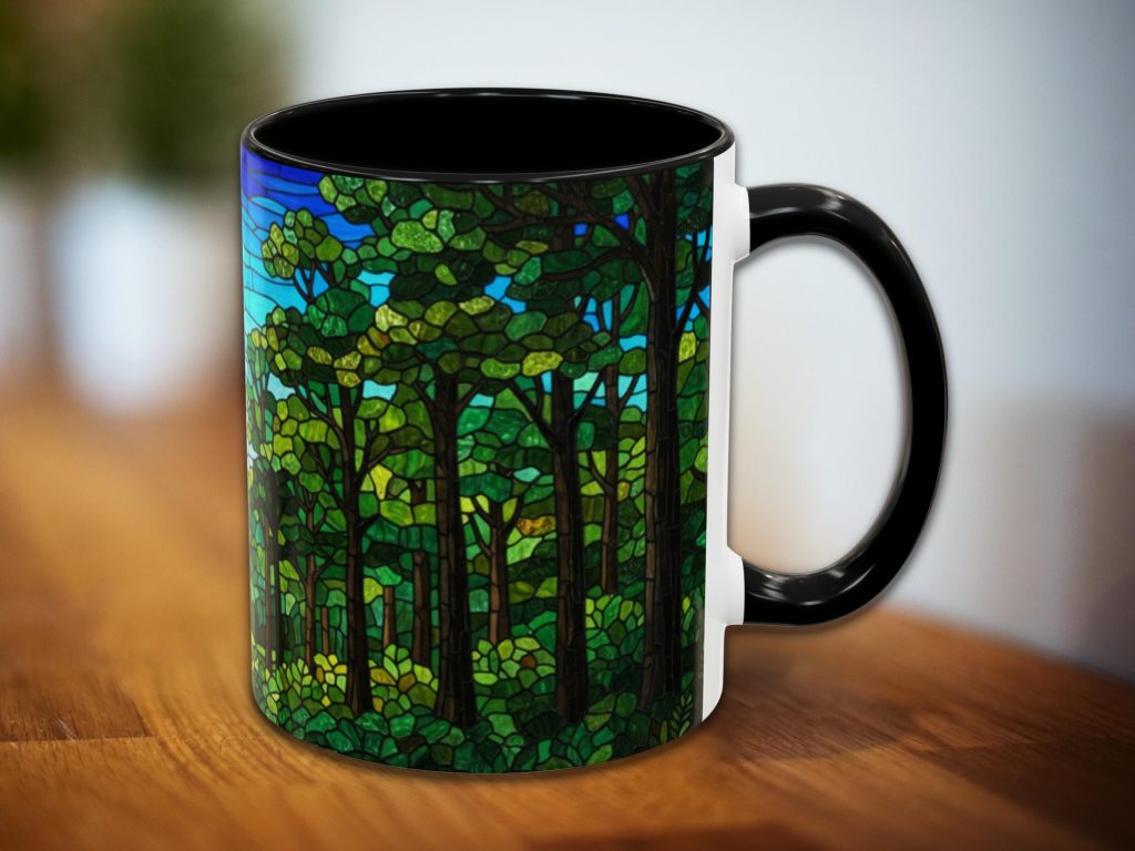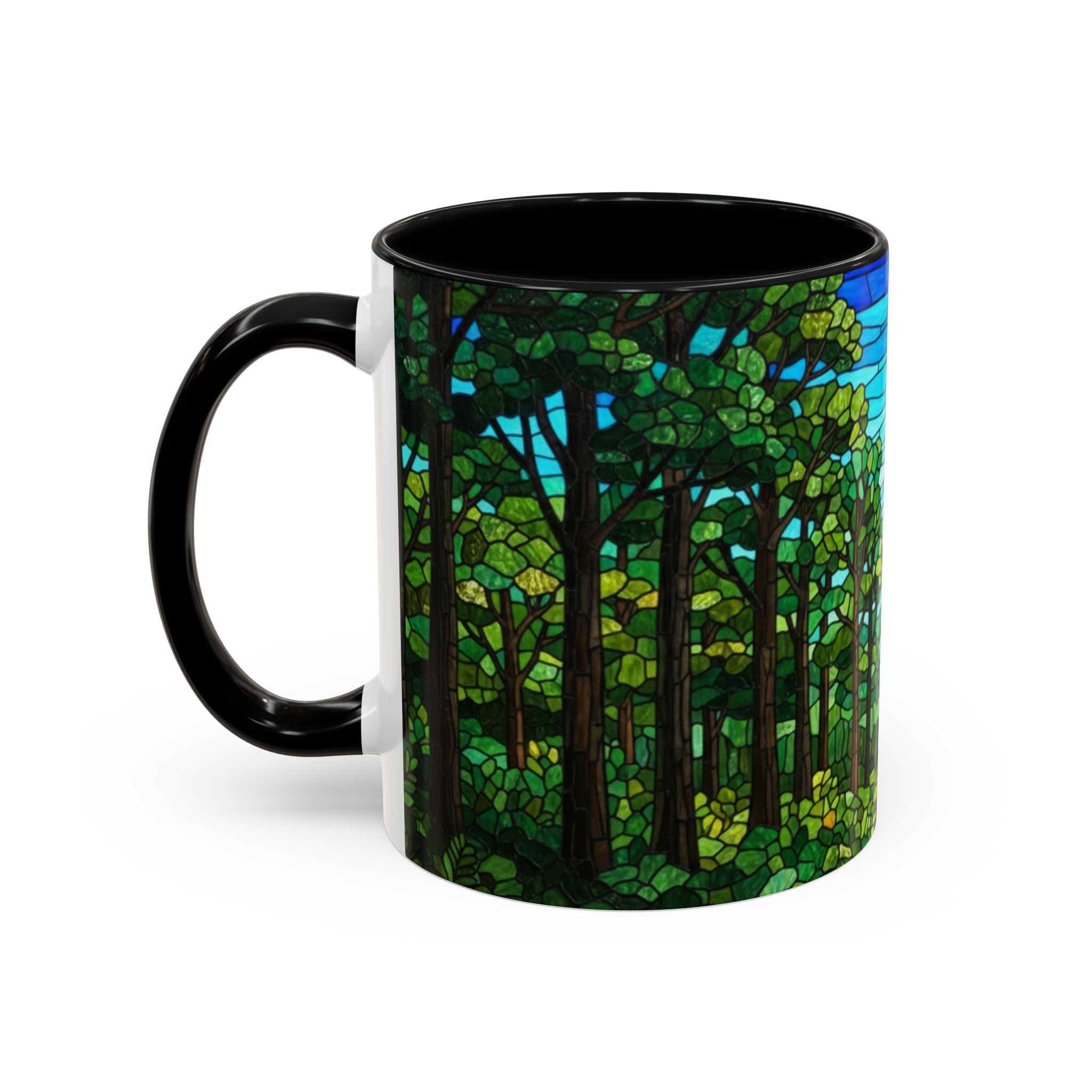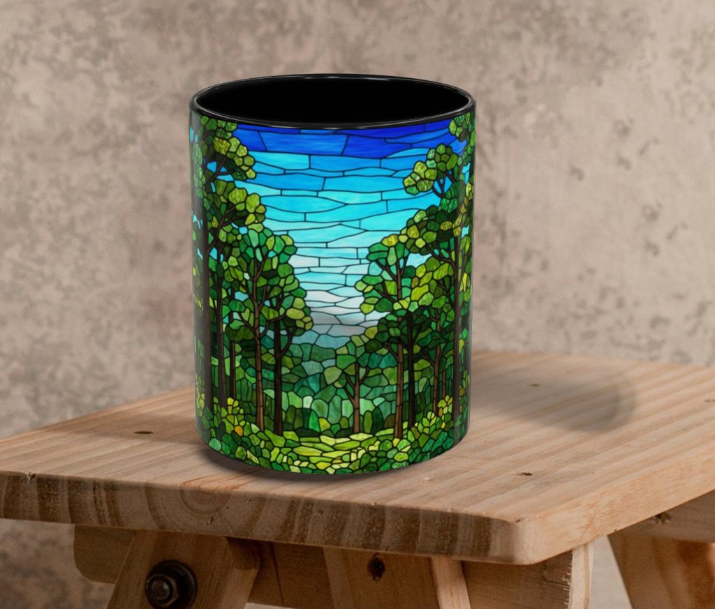 This ceramic accent stained glass forest mug features a beautiful landscape design, ideal for hikers and campers. Dishwasher and microwave safe for daily use.