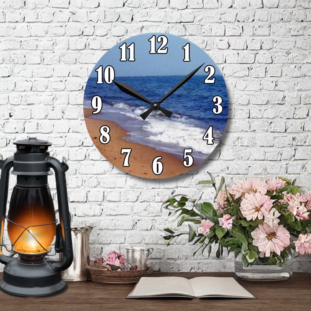 Welcome to your new beautiful Atlantic Ocean unique wall clock that is perfect for your nautical home decor. Our beach clock features a print of the beautiful Atlantic Ocean on a gorgeous sunny summer day. The waves of the ocean calmly glide over the soft sand on the New England coast. Makes the perfect addition to your ocean decor or nautical-themed room. It’s not just a clock, it’s an experience. Our clocks are handcrafted with love and precision, making each piece a one-of-a-kind work of art that will add character and charm to any space. Looking for a wedding gift or a housewarming present for someone’s first home? Look no further than our stunning collection of beach clocks that blend seamlessly into any beach themed, rustic or log cabin decor. Our clocks are also a thoughtful home gift that is sure to impress. Shop with us today and experience the beauty of time with our stunning New England Atlantic Ocean Unique Wall Clock.